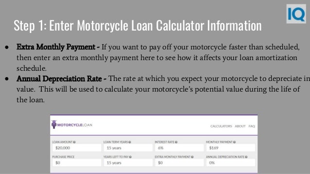 Check out our motorcycle loan calculator below and estimate how much you can expect to pay down the road.